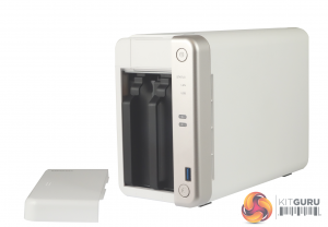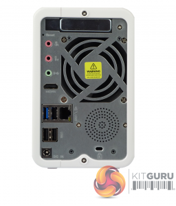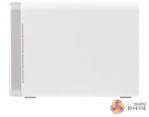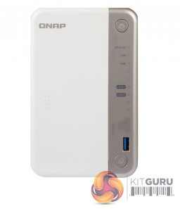 QNAP’s TS-251B is a compact and quite attractive looking 2-bay NAS with its white front bezel and side panels. The silver grey front panel holds the power and USB copy buttons and the five indicator LEDs (reading from top to bottom they are: status, LAN, USB and two for drive activity).