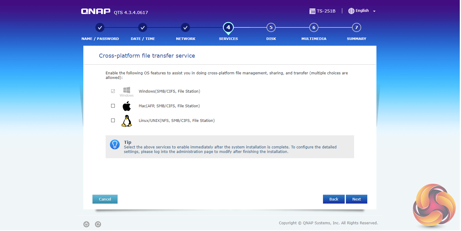 During the setup you can enable which OS cross-platform file management service you require – Windows (SMB/CIFS, File Station, FTP), Mac (SMB/CIFS, File Station, FTP) and Linux (NFS, SMB/CIFS, File Station, FTP).