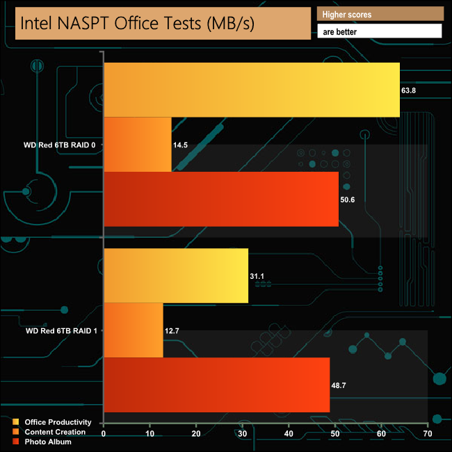 In the office tests, the performance drops considerably in the Office Productivity trace when drives are in a RAID 1 array.