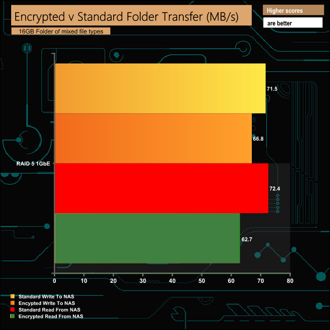 The hardware encryption engine of the Realtek RTD1296 processor that powers the TS-328 works very well, dropping just 2.7MB/s when encrypted data is being written to the NAS and 9.7MB/s when the data is read back.