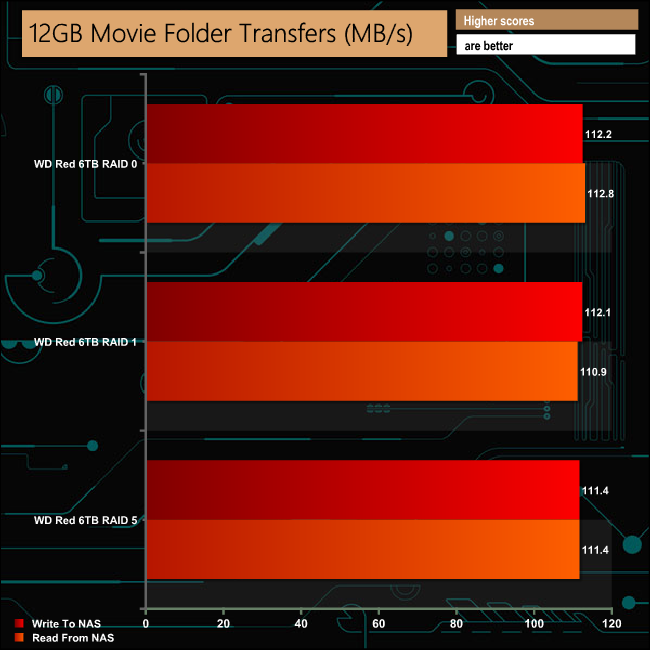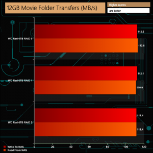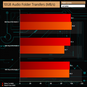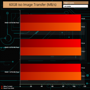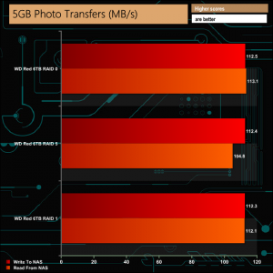 The TS-328 showed good consistency throughout our real life data transfer tests. Having said that there were a couple of times when the RAID 5 read performance dipped a little compared to RAID 1. In the 10GB Audio file transfer there was a 10MB/s difference between the RAID 1 and 5 read performance and in the 5GB Photo transfer the difference was 9.6MB/s.
