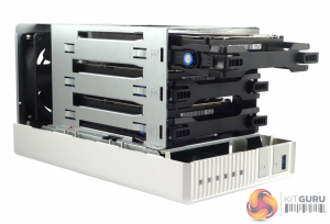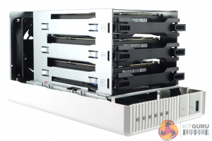 To get to the internal drive cage and the three drive trays you undo the three small thumbscrews on the rear panel and slide the two sides of the TS-328 apart. The hard drive trays are held in place by a simple but effective pair of sprung clips on the front of each tray. Pushing on the clips allows you to pull a drive tray out.