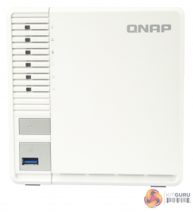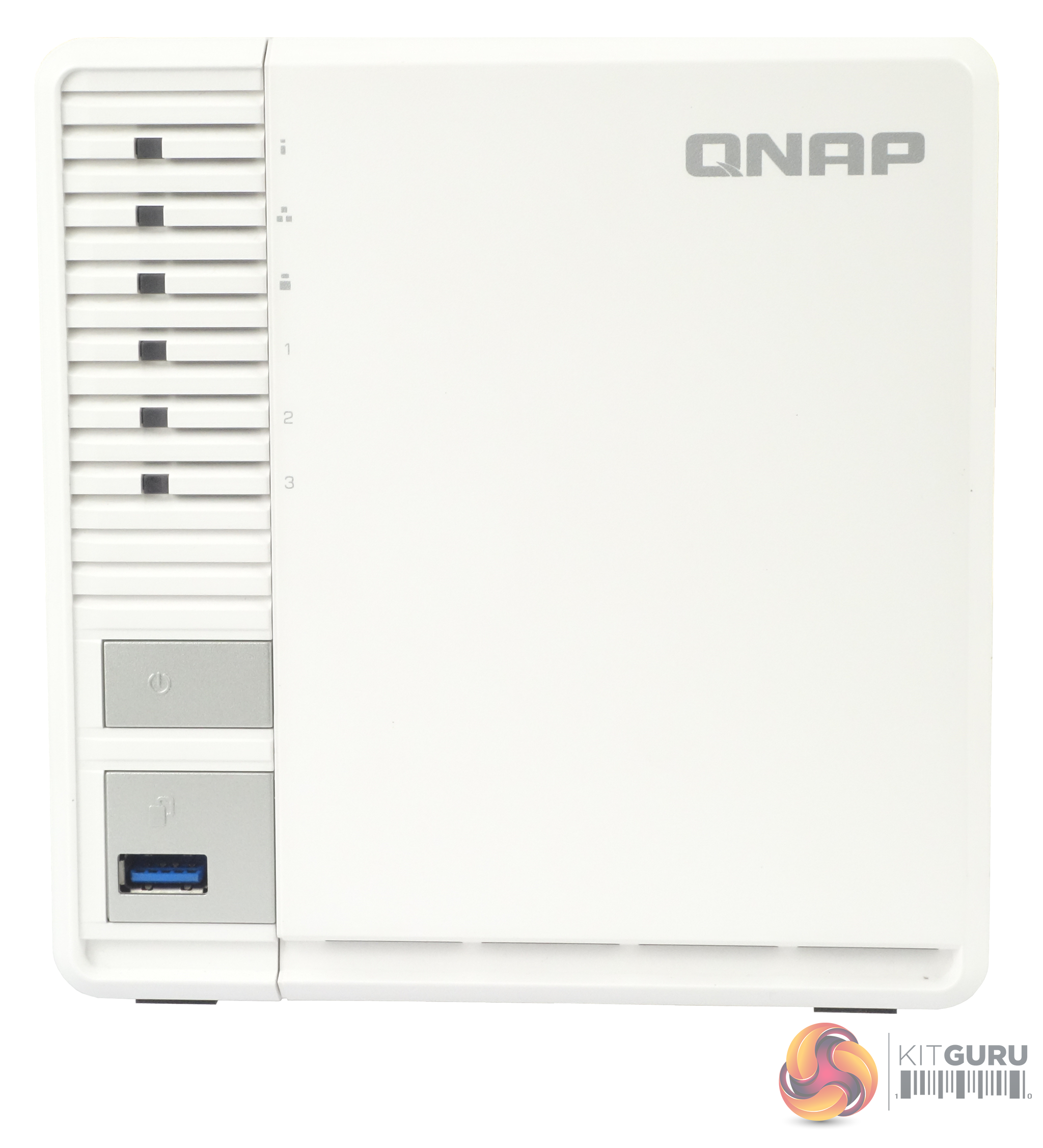 QNAP's TS-328 is a compact and quite attractive looking NAS with its white front bezel and side panels with silver grey power and USB copy buttons. Dominating the left side of the front bezel are the six indicator LEDs (reading from top to bottom they are: status, LAN, USB and three for drive activity). We say dominating, as these LEDs certainly grab your attention as they seem so much bigger than normal. So big in fact that we actually measured them – 4mm x 3mm. One thing is for certain you're not likely to miss them blinking away.