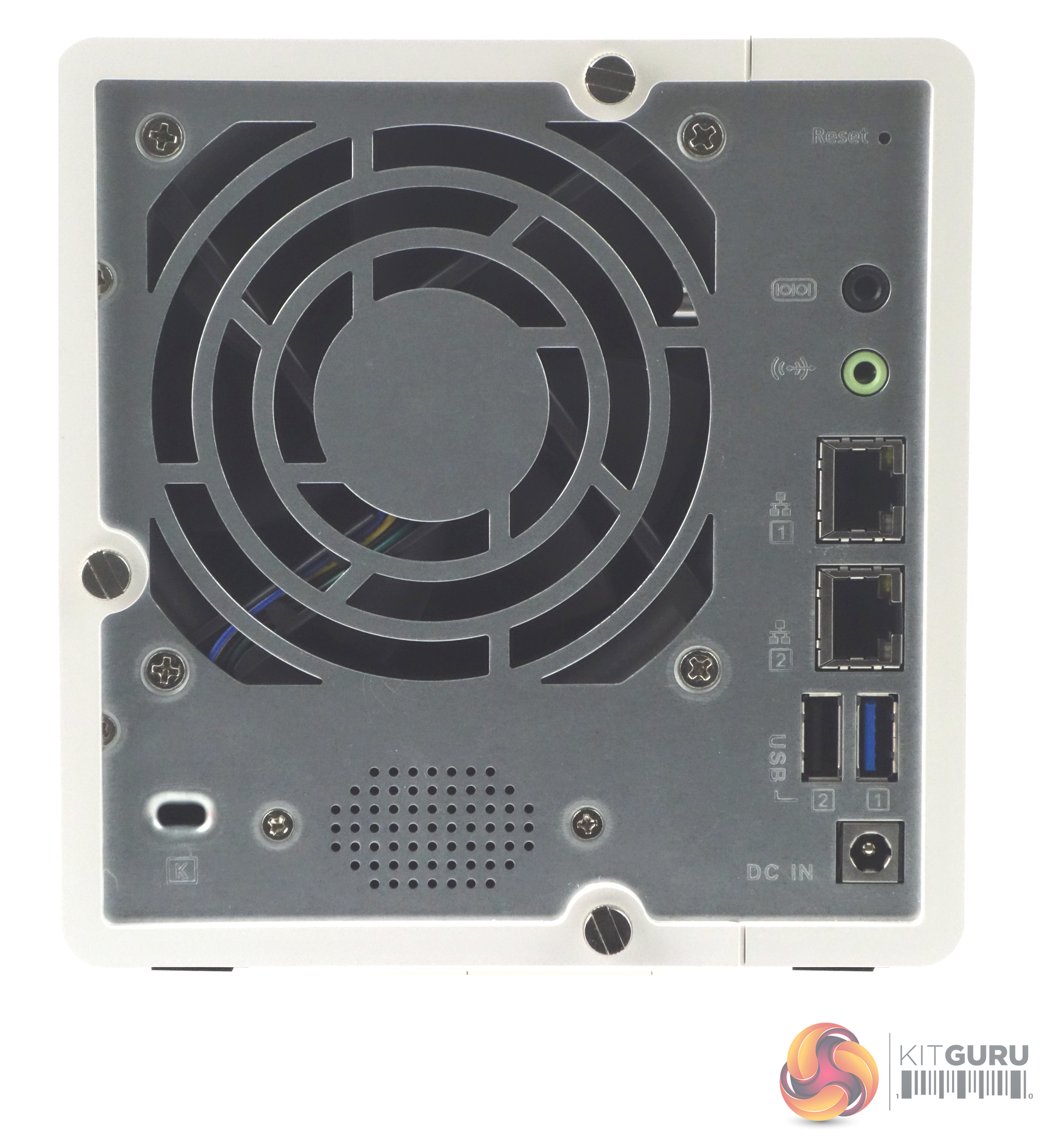 The real panel is dominated by the grill for the 90mm cooling fan. To the right of the grill sit all the external ports; 3.5mm speaker and line out jacks, two Gigabit LAN ports, which is a nice surprise for this level of NAS, and single USB 2.0 and 3.0 ports.