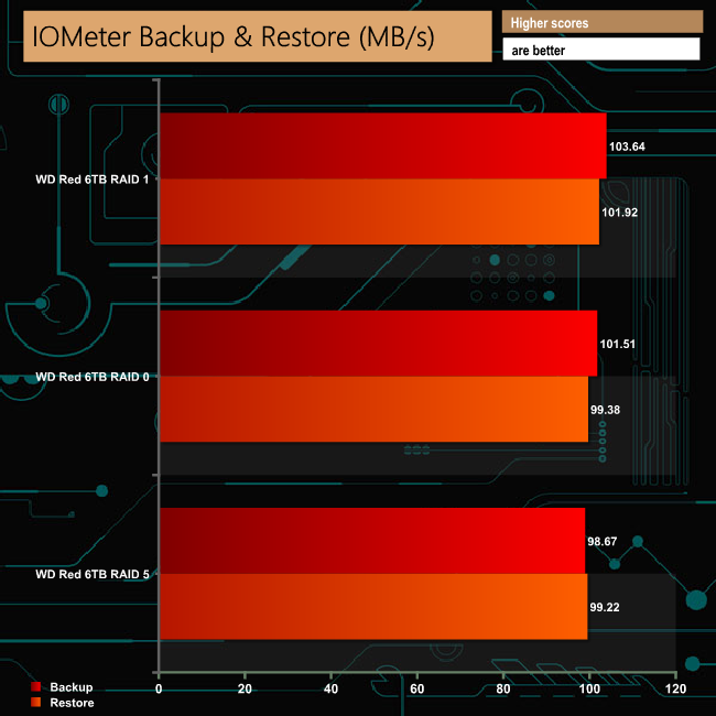 The TS-328 had no problem dealing with our backup/restore test, averaging 101MB/s for the backup test and 100.1MB/s for the restore test across the three arrays.