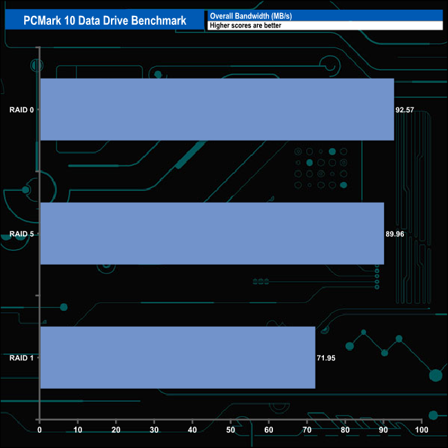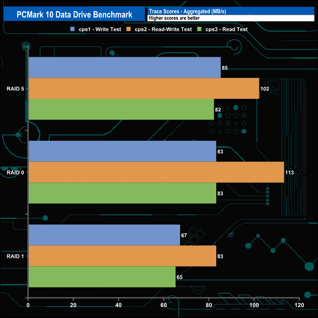QNAP's TS-364 handles PCMark's 10 Data Drive Benchmark very well. In terms of overall bandwidth, there's not much to choose between RAIDs 0 and 5. The same also applies to the individual cps1, 2 and 3 test traces.