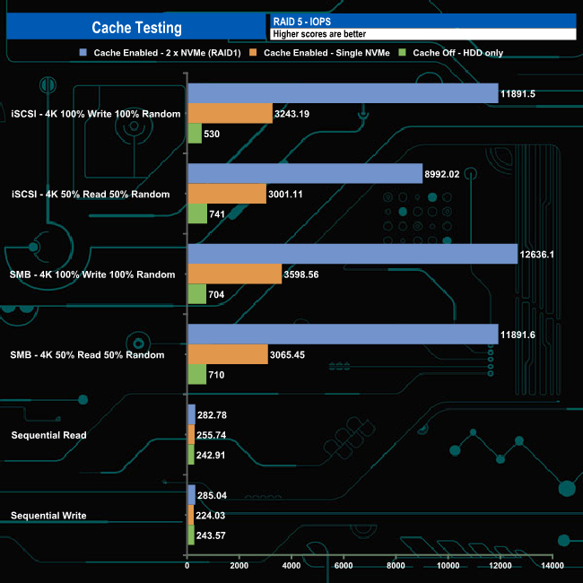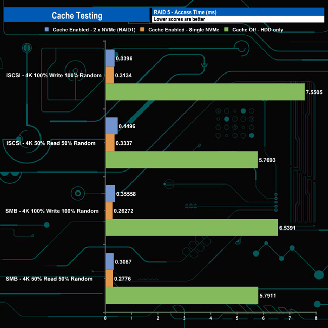 As you can see from the results, cache acceleration can give huge gains in performance but only with certain workloads. For example, it makes very little or no difference to Sequential read or write operations compared to the gains when dealing with random workloads.