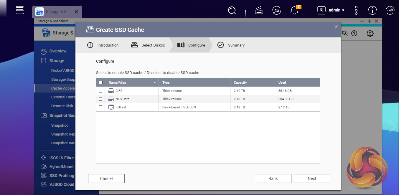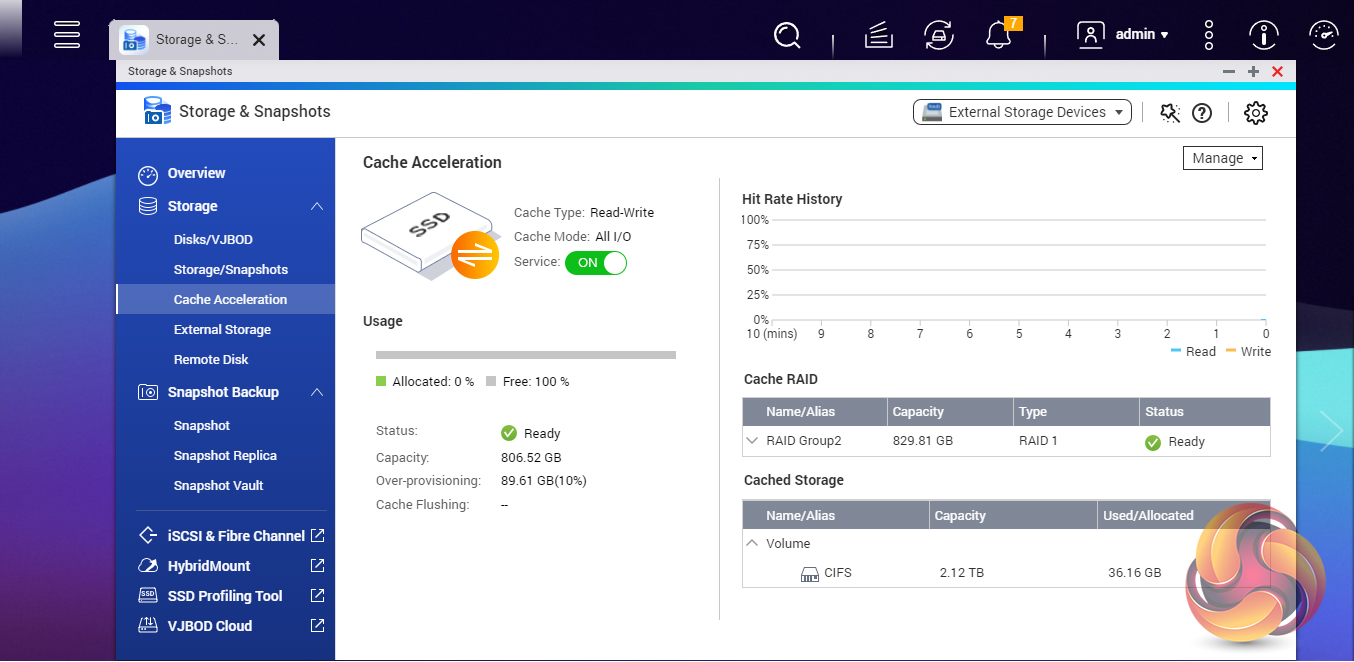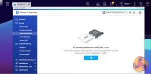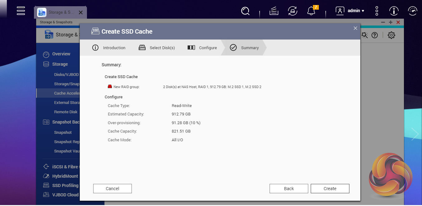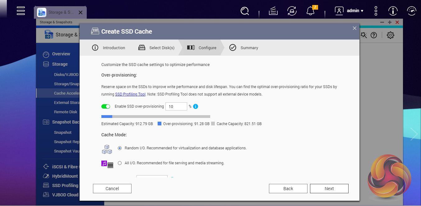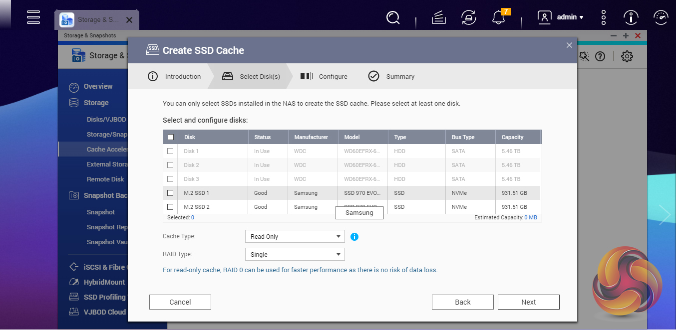 Setting up SSD caching duties is really straightforward thanks to QNAP's easy to follow wizard in the Cache Acceleration subsection of the Storage & Snapshots element of the QTS OS. The cache can be set up as read-only, write-only or read-write using a single drive or a pair built into a RAID array.