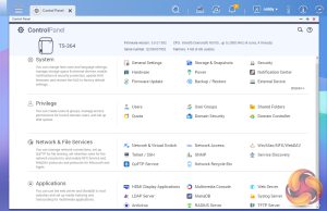 Clicking on the Control Panel icon on the main menu screen brings the complete control panel window with all the various functions of the NAS neatly divided up into four sections; System, Privilege, Network & File Services and Applications. Again any of the icons in these sections can be dragged onto the main page for easier access.