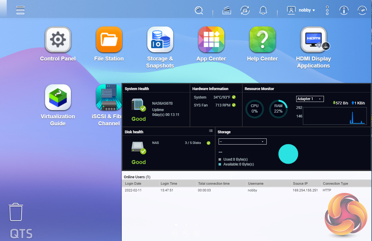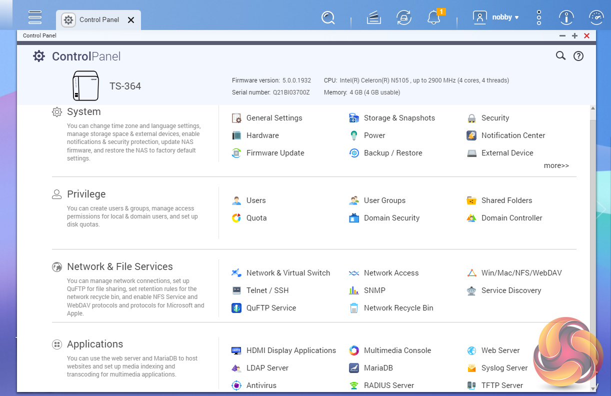 To test the TS-364 we used the latest 1932 build (the latest version at the time of testing) of QNAP's QTS 5.0.0 OS. QTS is a graphically rich OS with links to the major functions appearing as icons on the main page. QTS 5.0 uses the new Linux Kernal 5.10 which brings with it improved security (TLS1.3 support), better PCIe performance (which in turn brings improvements in NVMe SSD performance) and WireGuard VPN support.