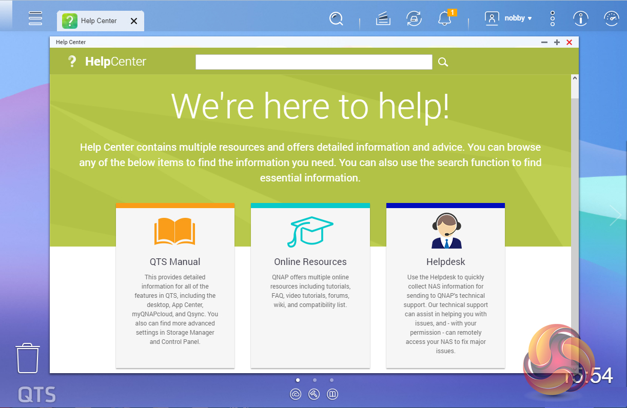 When you access the NAS for the first time you are met by the HelpCenter app. This comprehensive help utility provides access to the QTS manual, Online Resources including tutorials, video tutorials, FAQs, and forums – or if all else fails you can connect to the QNAP Helpdesk for technical support.