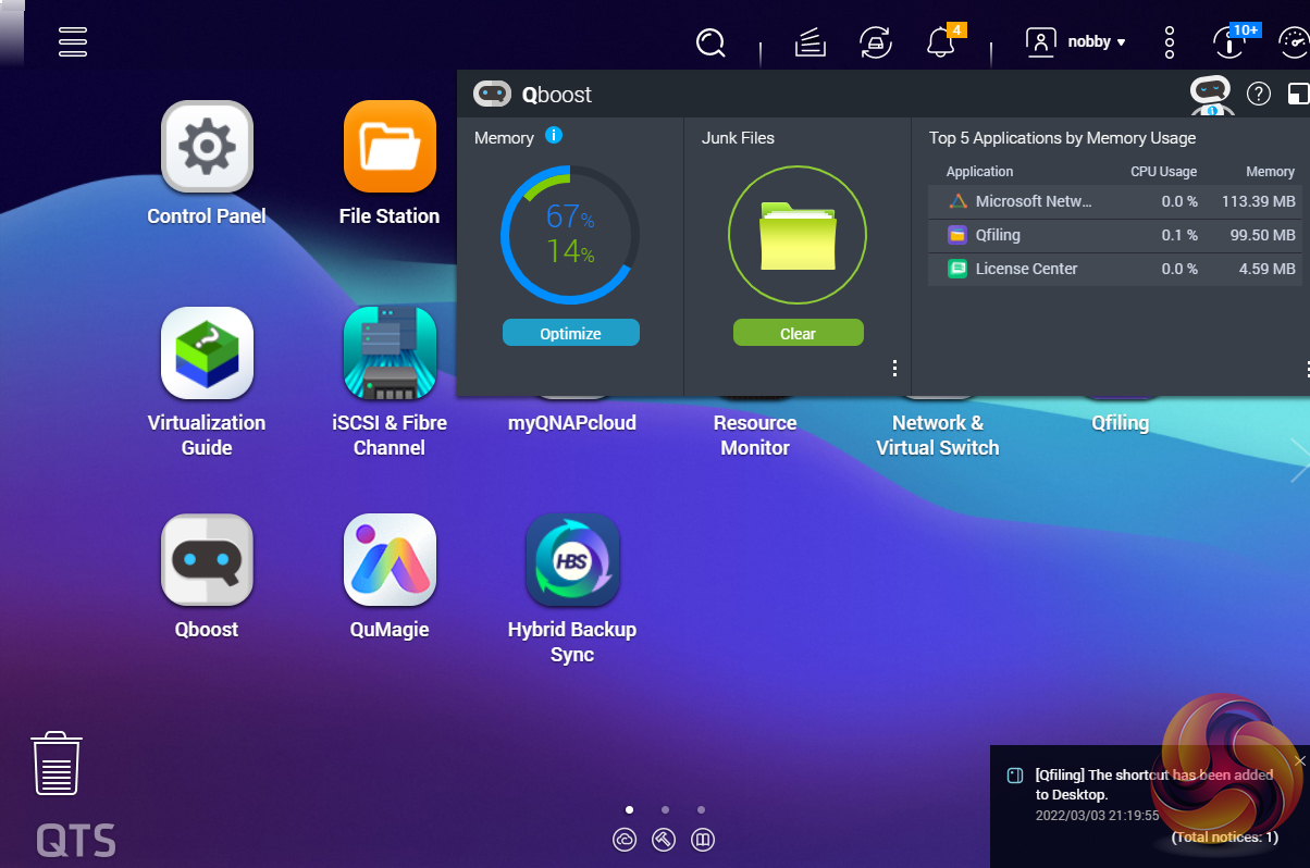 Qboost is an optimisation app that helps maintain the NAS at peak performance. It can free up system memory, reclaim storage space by clearing unnecessary system files and the recycle bin and help balance system load by managing schedules for most applications and services.