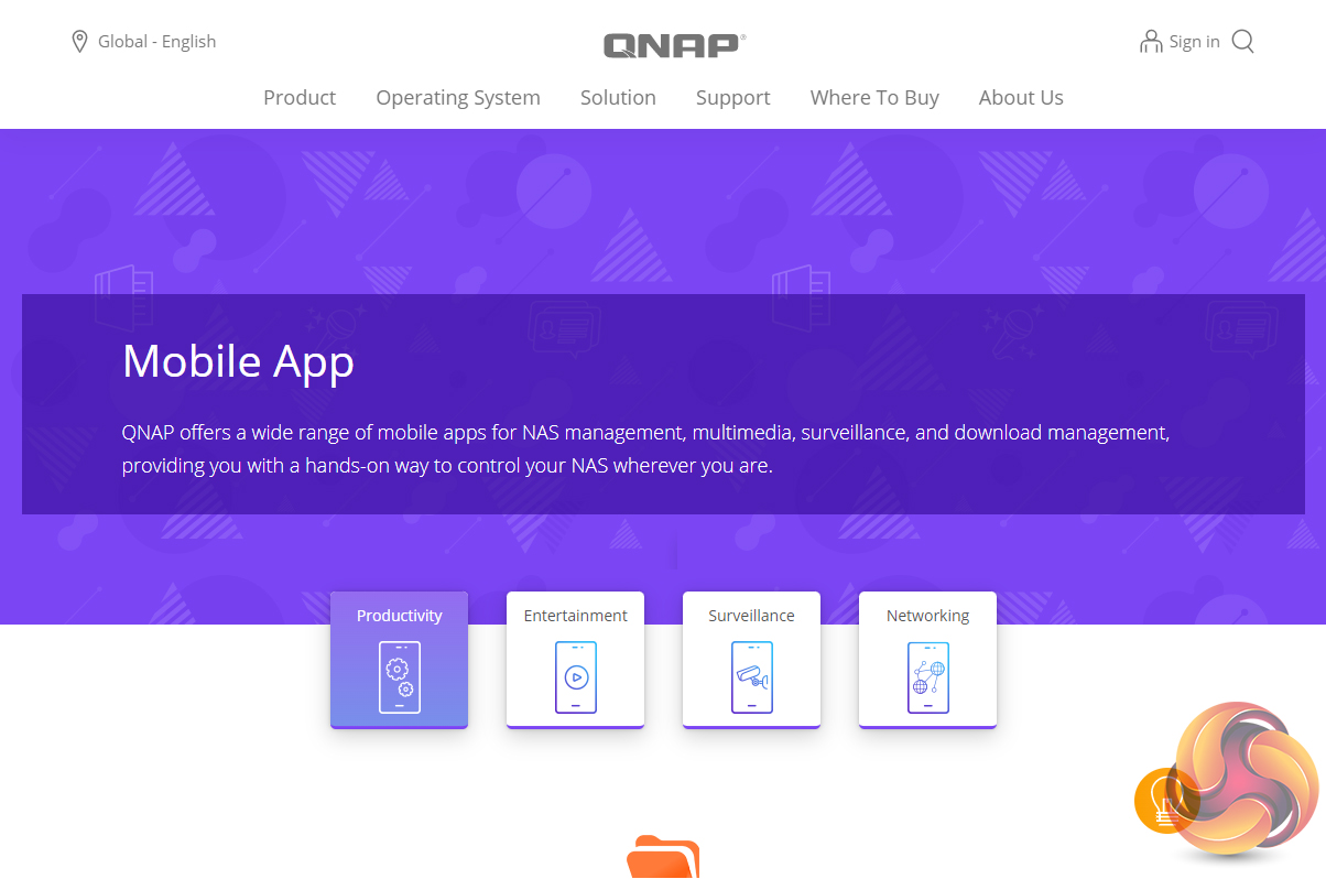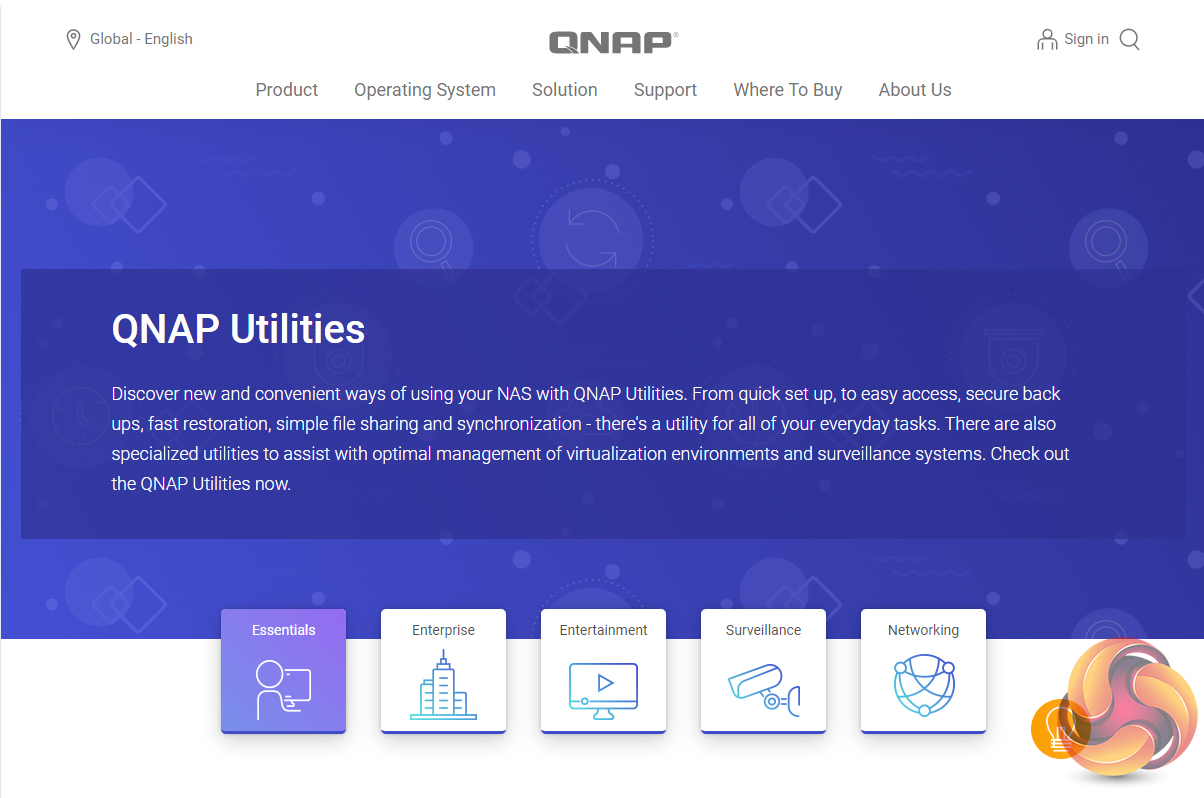 At the bottom of the main screen are three small icons. These are shortcut links to four pages on Qnap's website; my QNAPcloud website, the middle one has two options, Mobile App and Utility, which link into the mobile apps and utility pages. The last button is for feedback, linking to a Wiki page, the Qnap Community Forum or customer service splash screen.