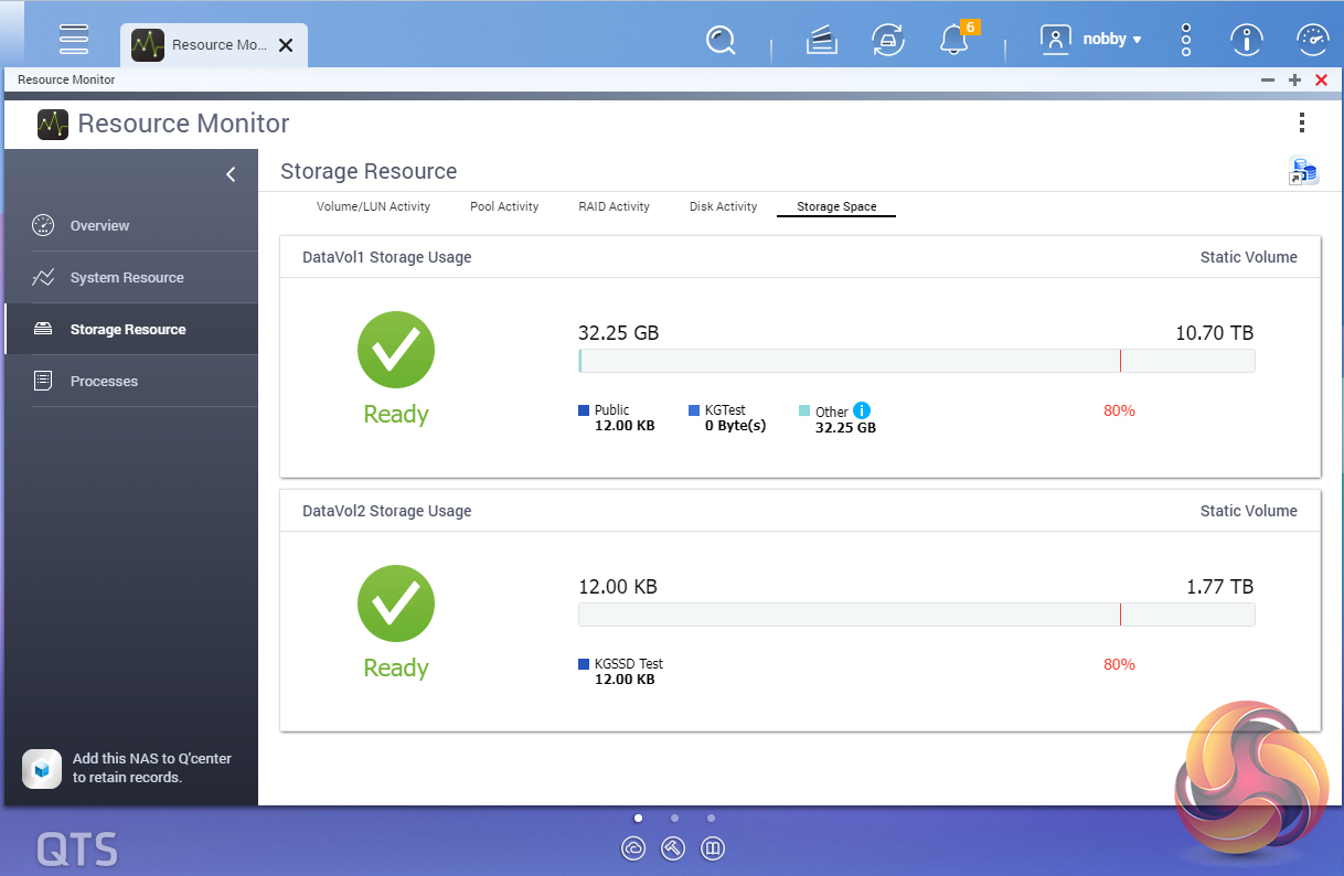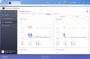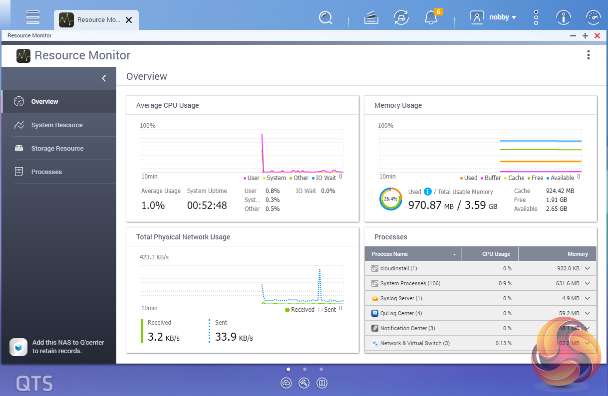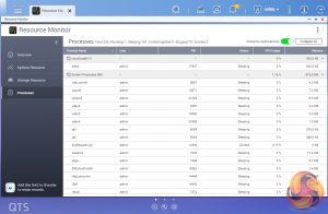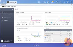 The Resource Monitor is a one-stop shop for monitoring various elements of the NAS and offering detailed information on how the storage is being used. It is divided into four sections; Overview, System (with separate tabs for the CPU, Memory and Network), Storage (with separate pages for pool, RAID and disk activities and how the storage space is being used) and Processes.