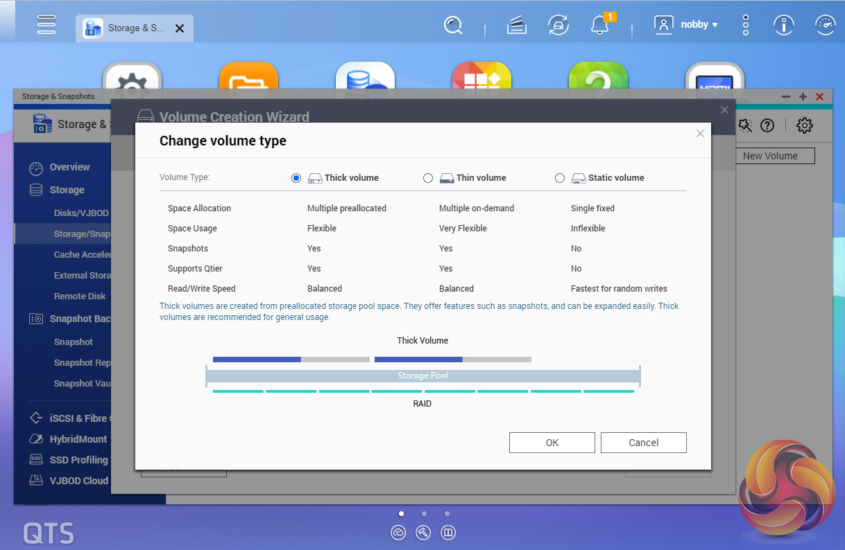 The Volume Creation Wizard is an easy-to-follow step-by-step guide to creating volumes. You can choose between single Static (best for overall read/write performance but without support for the most advanced features), Thick Multiple (a good between performance and flexibility) and Thin Multiple (enables for efficient use of storage space) and then RAID type.