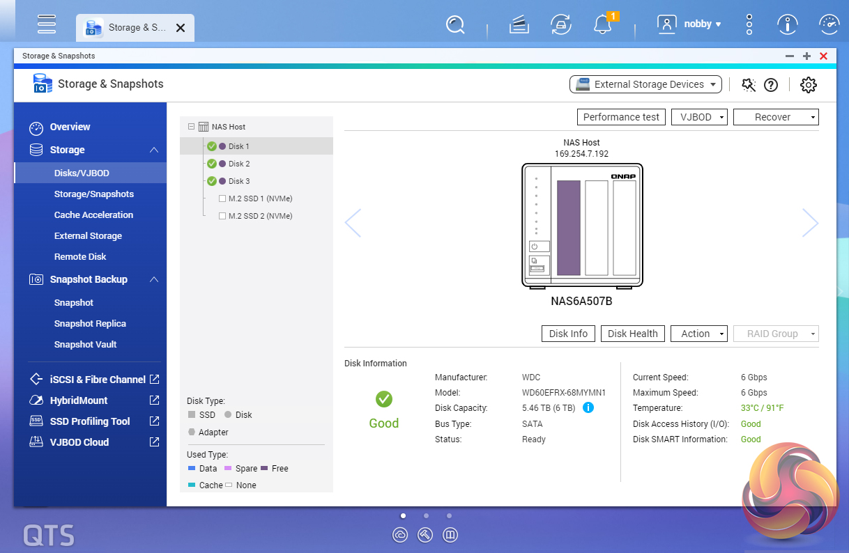 This page displays information about all the drives used in the NAS system including active drives, drive type, data type, drive temperature and which bay the drive occupies. There is even a performance test you can run to see how the drives are shaping up.