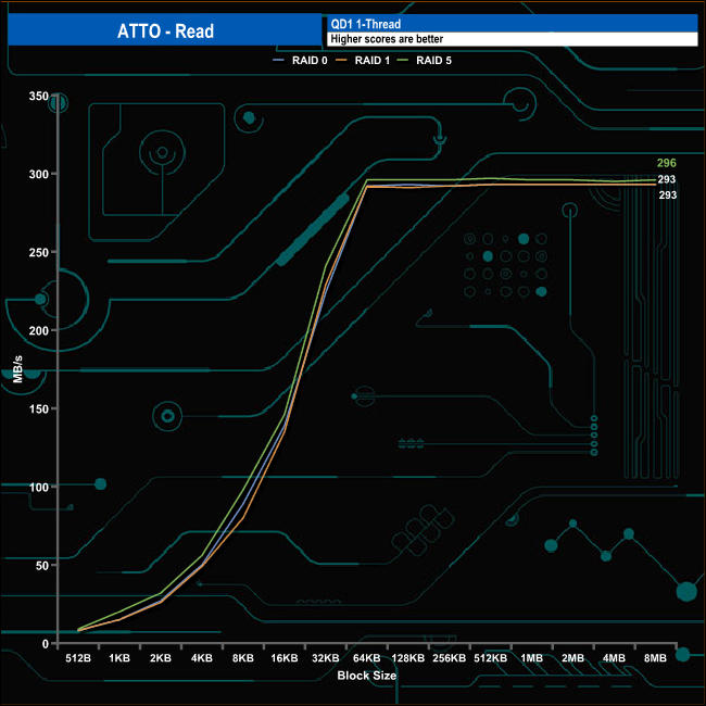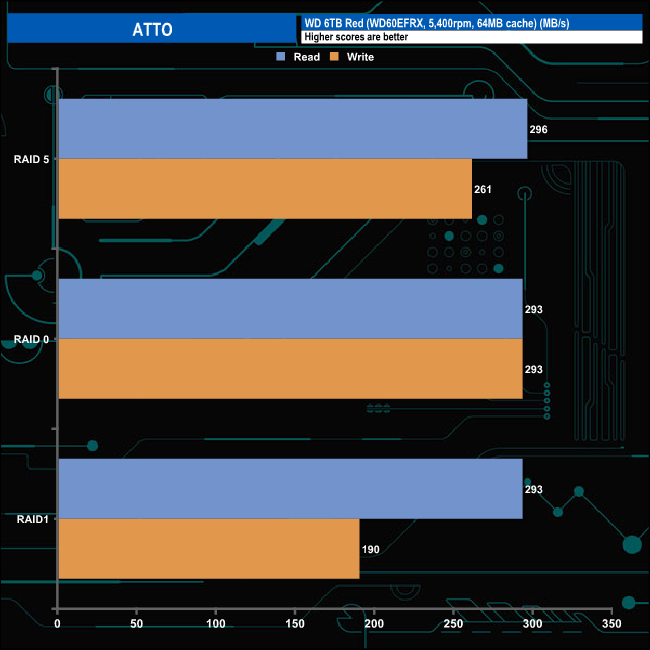 QNAP quote throughput figures for the TS-364 using a RAID 5 array as up to 271MB/s with writes at 251MB/s. Using the ATTO benchmark we could confirm those RAID 5 figures and even better them a little with test results of 296MB/s and 261MB/s for read and writes respectively. In RAID 0 we saw a figure of 293MB/s for both reads and writes while a RAID 1 array gave 293MB/s for reads and 190MB/s for writes.