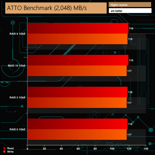 The TS-431XeU averages 118.5MB/s for reads and 117.25MB/s for writes across the four arrays which is the about the performance you would expect to see from a 1GbE connection.