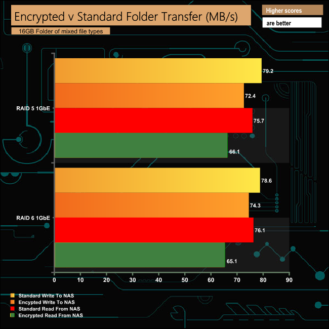 The hardware encryption engine in the Annapurna Labs Alpine AL-314 works very well and keeps the performance loss when dealing with encrypted data to a minimum. In RAID 5 it loses just 6.8MB/s and 4.3MB/s in RAID 6 when in writing mode. When reading encrypted data the loss in RAID 5 is 9.6MB/s and in 11MB/s RAID 6.