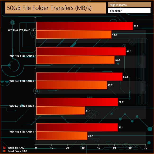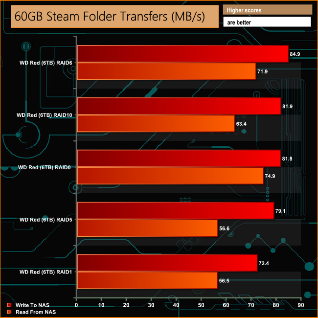 When it comes to dealing with the small files in the 60GB Steam and especially the 50GB file folder, the read performance in RAID 5 and 1 lags behind the other arrays. The RAID 5 read performance improves when it comes to the 10GB Audio folder transfer, but this time it is the RAID 6 and RAID 1 reads that lag behind. The RAID 6 read performance also lags behind when dealing with the larger file sizes contained in the 12GB Movie Folder.