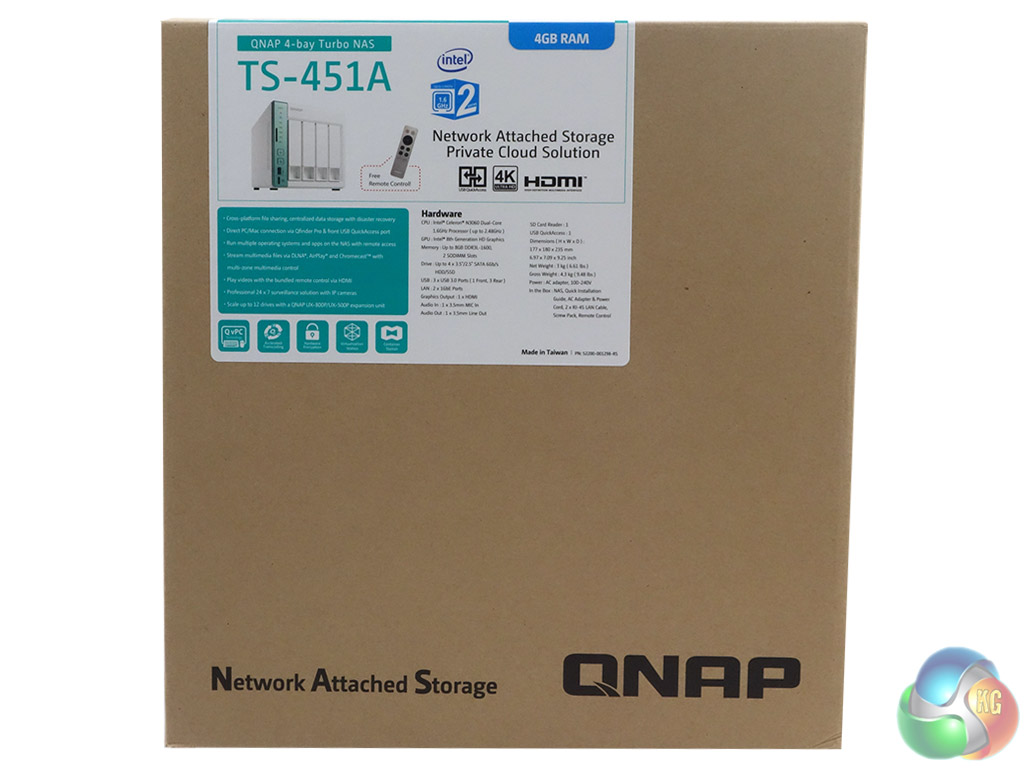 The TS-451A-4G comes in a large brown box with a small label on the front which has an image of the NAS and the model's memory capacity and two panels. The rear of the box just has a group of icons displaying some of the major utilities; Data Protection, Private Cloud, File Sharing, Backup Station, Surveillance Station and Mobile Mangement.