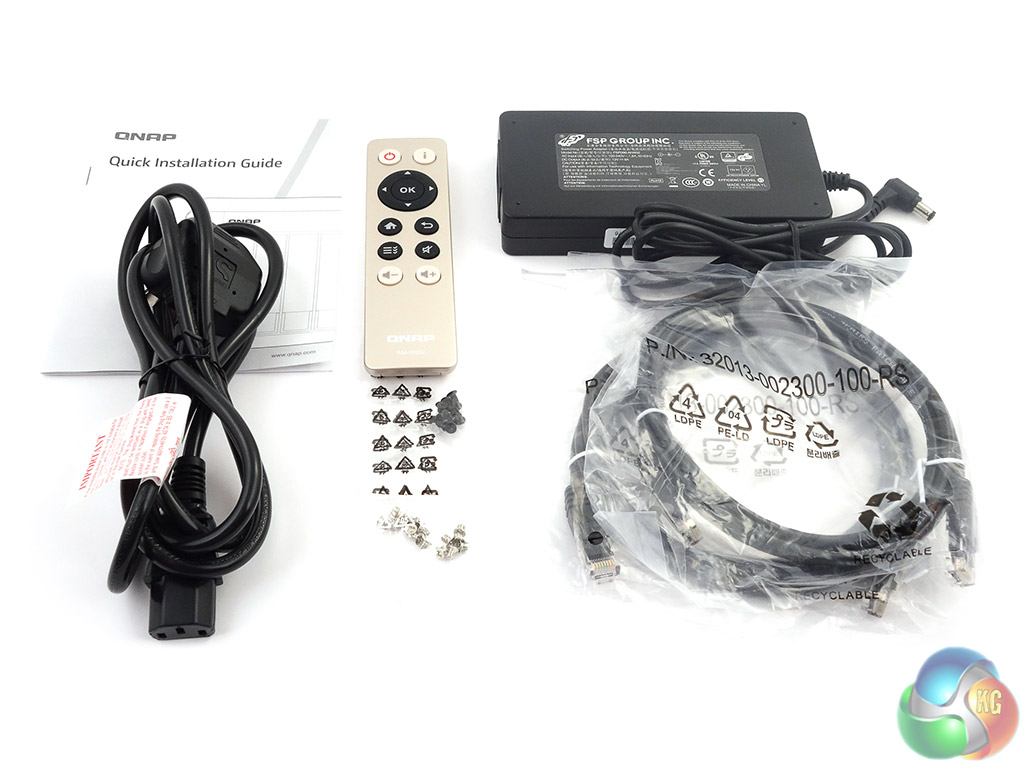The box bundle is pretty comprehensive; a pair of Ethernet cables, two sets of mounting screws for 2.5in and 3.5in drives, a 96W power adaptor, power cable, RM-IR002 remote control and a quick installation guide.