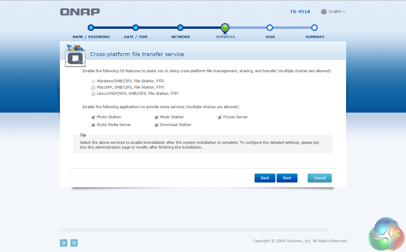 From then on it's just a matter of following the wizard through the install process. During the setup you can enable which OS cross-platform file management service you require; Windows (SMB/CIFS, File Station, FTP), Mac (SMB/CIFS, File Station, FTP) and Linux (NFS, SMB/CIFS, File Station, FTP). At this stage you can also load a few basic apps; Photo Station, Music Station, iTunes Server, DLNA Media Server and Download Station.