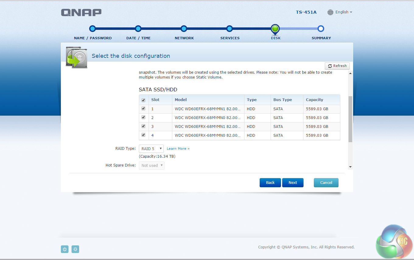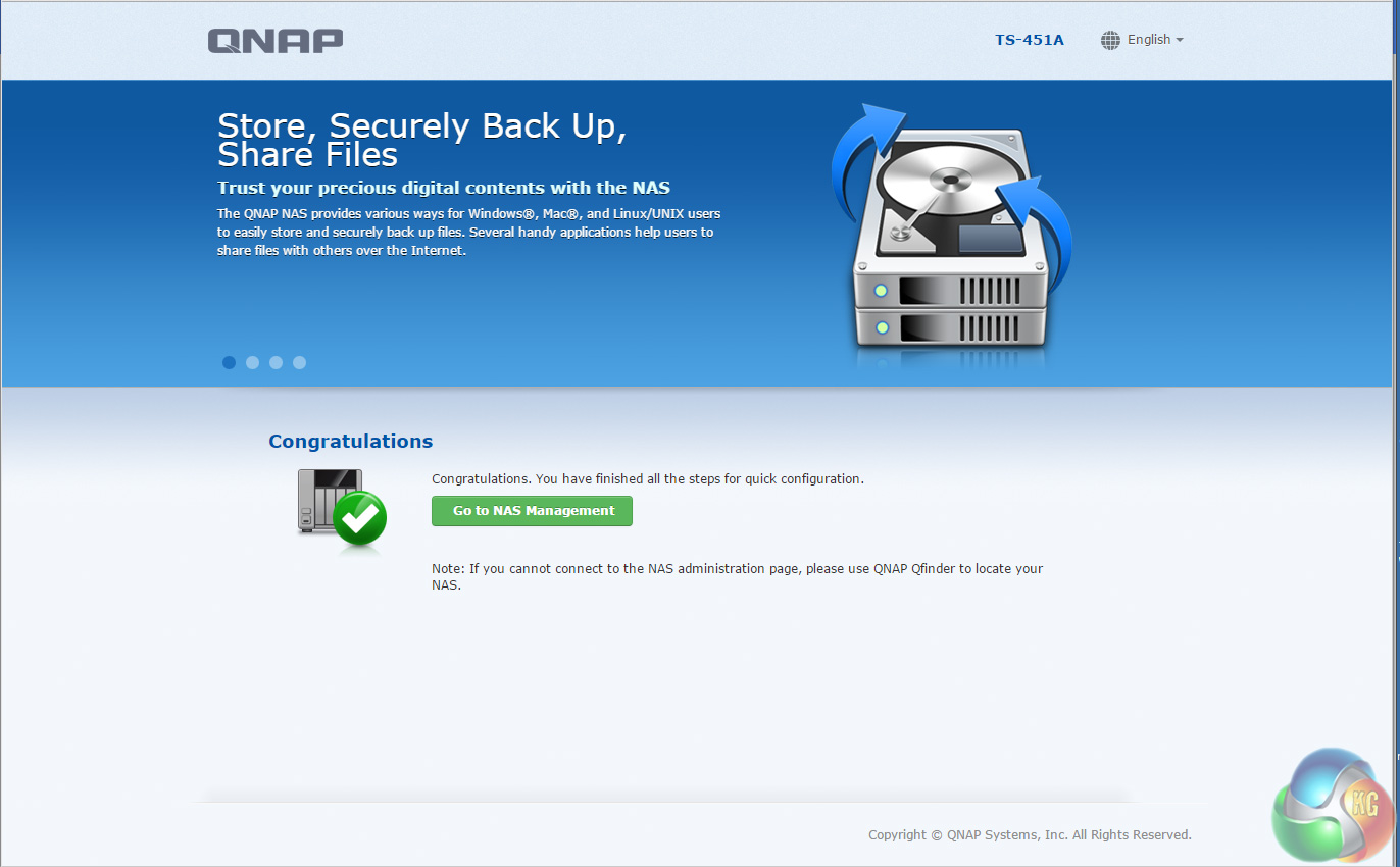 The default setup for the TS-451A-4G with four disks is RAID 5. It takes around 20 minutes to get the NAS set up and ready to use but obviously longer to get the disks synchronised (it took around 15 hours to synchronise the 4 6TB disks we were using for testing in a RAID 5 array). Once the NAS is set up, clicking on the NAS in the QFinder Pro brings up the log in screen.