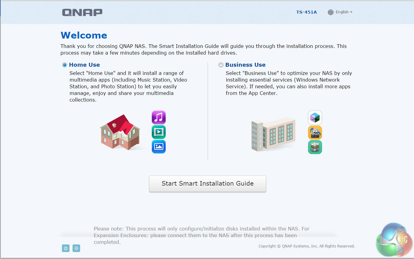 There are two ways of setting up the TS-451A-4G, either online by entering the Cloud key which is on the side of the unit or by using QNAP's Qfinder Pro utility. Once Qfinder Pro has located the NAS, clicking on the NAS details brings up the Smart Install Wizard which gives you a choice of install options; Home or Business.