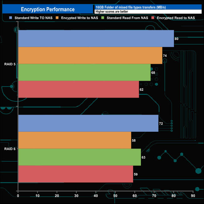 The AES-NI hardware encryption engine in the Intel Celeron J4025 does a very good job of negating the effects of dealing with encrypted data. Best performance came with the drives built-in a RAID 5 array dropping just 6MB/s when writing encrypted data to the NAS and reading it back. In a RAID 6 array, the drive drops 14MB/s when writing the encrypted data but just 4MB/s when reading the data.