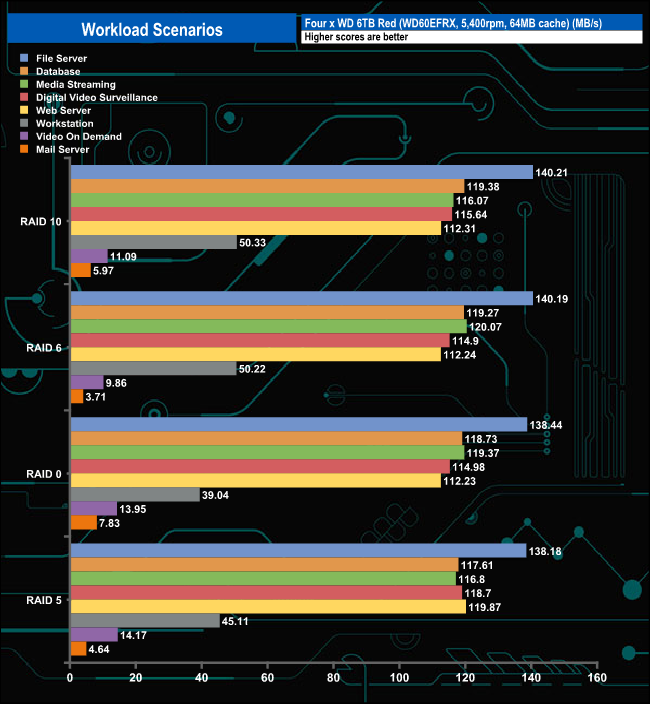 We also tested the NAS in a few scenarios it might be used for in an office environment. It produced average bandwidth speeds of 139.25MB/s and 114.164MB/s for the File Server and Web Server tests respectively, 34.92MB/s for the Workstation test and 118.74MB/s when tested with the Database trace.