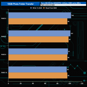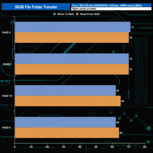 To test real-life file/folder performance we use a number of different file/folder combinations to test the read and write performance of the NAS device. Using the FastCopy utility to get an MB/s and time taken for each transfer, the data is written from and read back to a 240GB SSD.