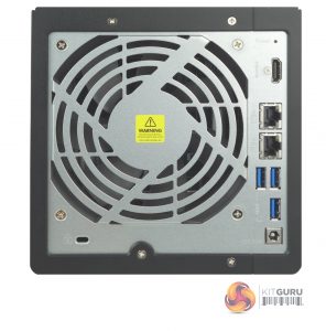 Dominating the rear panel of the TS-451D2 is the grill for the 120mm system cooling fan. To the right of the fans are the ports. First up is an HDMI 2.0 port (supporting up to 4K (4,096 x 2,160) @60Hz, under which sits two Gigabit Ethernet ports and then there are a group of three USB 3.1 Gen 2 Type-A ports.