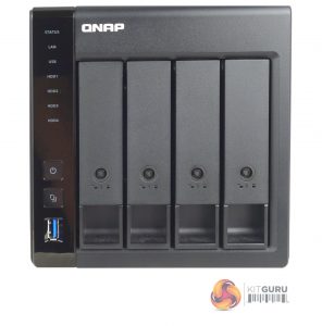 The TS-451D2 is a compact tower NAS with a metal chassis supporting four vertically mounted drive bays. To the left of the drive bays are all the indicator LEDs (Status, LAN, USB, and four drive activity) as well as the power button, the one-touch copy button, and its associated USB 3.1 Gen 2 Type-A port. How this button handles data from an external drive can be configured in the QTS OS.