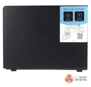 One side panel of the NAS has a series of holes drilled in it to help with keeping the unit cool while the other side panel has a sticker with the Cloud key details to help set the NAS up.