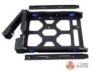 The 3.5in drive trays are tool-free. A plastic strip fits into the side rails with a pin at either end that goes through the corresponding holes in the rail sides. The holes in the tray sides have rubber vibration-reducing grommets fitted. The rail pins then lock into the mounting holes on the drive's side – simple but effective.