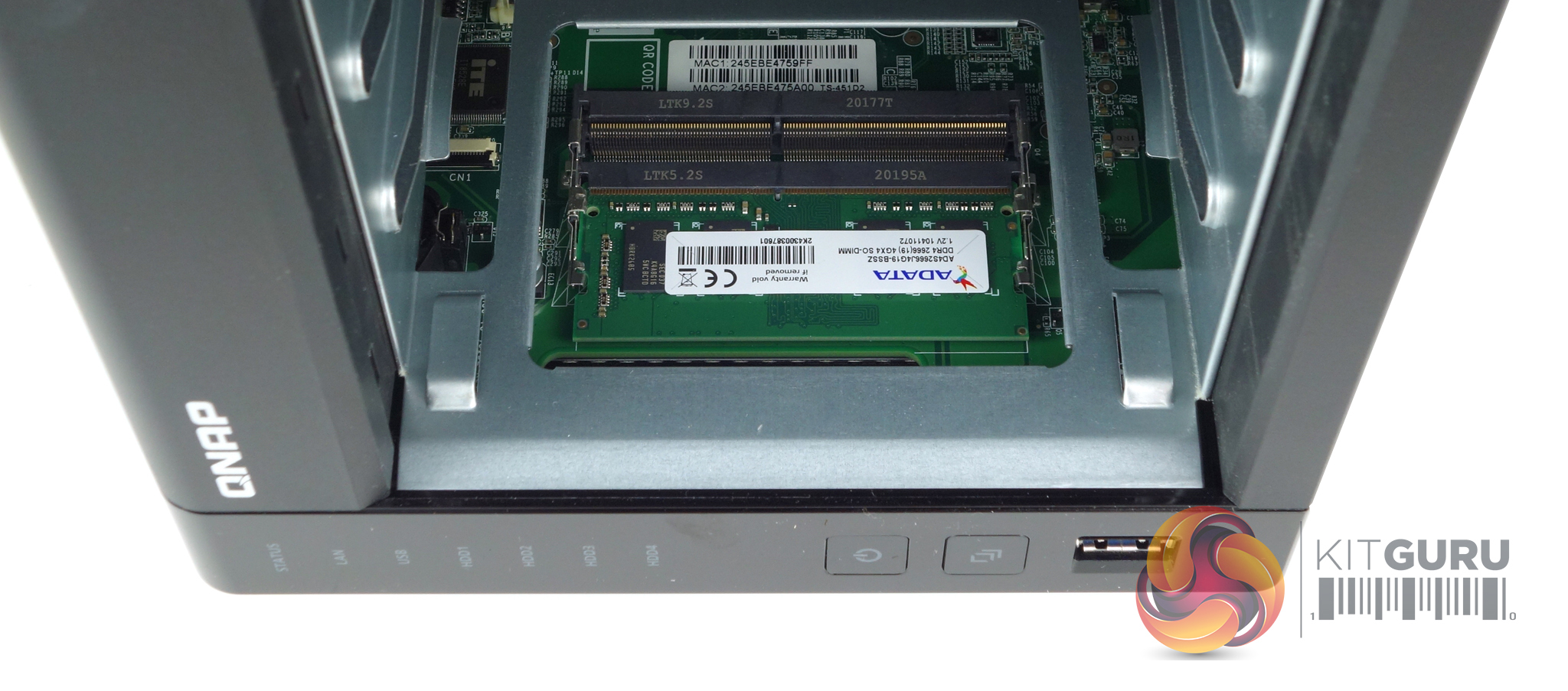 The mainboard of the TS-451D2 supports up to 8GB of DDR4-2400 via two SO-DIMM slots. To access these slots you first have to remove the drive trays as the slots are situated in the front left side of the drive bay space.
