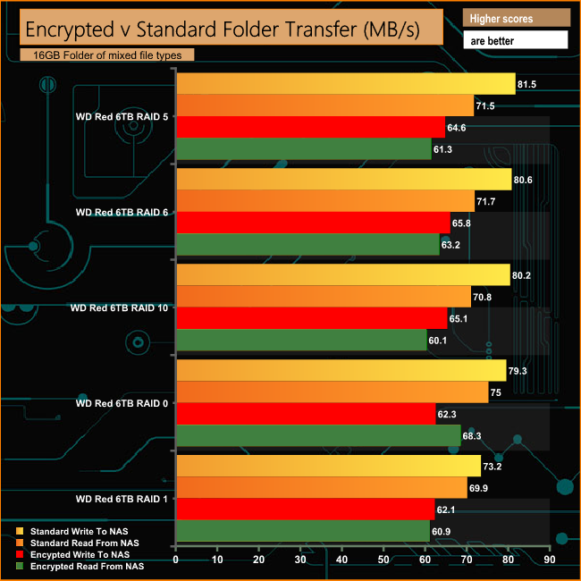 The integrated encryption engine in the TS-453B boosts the read/write performance when dealing with encrypted files. In RAID 5 the performance drops just 17MB/s when writing to the NAS with just 10MB/s dropped when reading the data back.