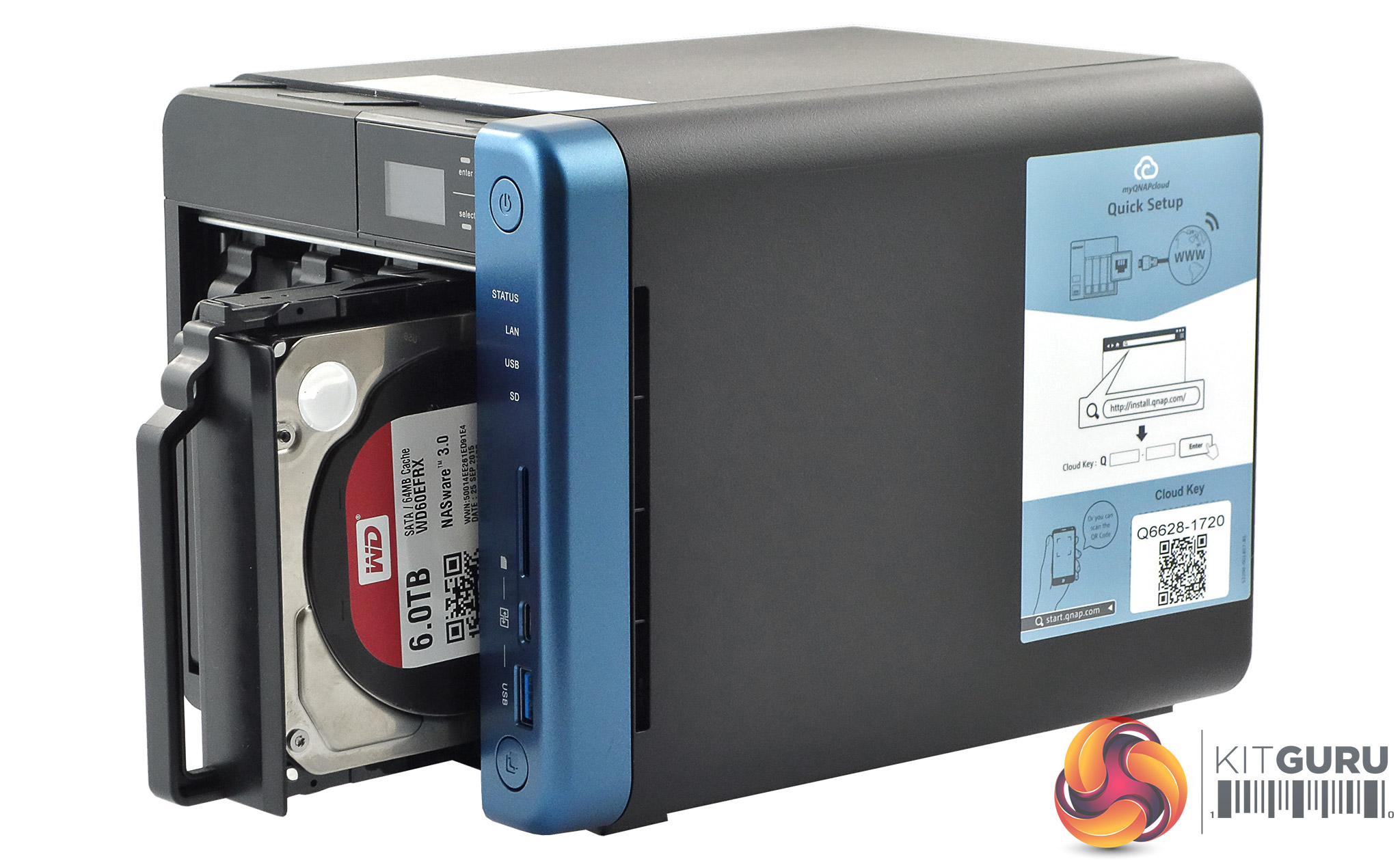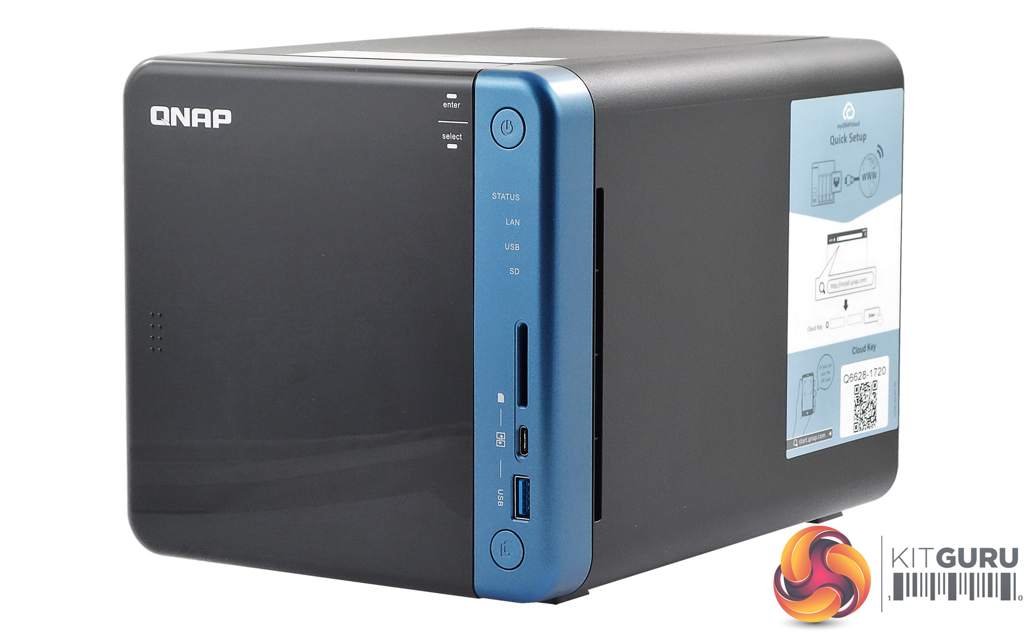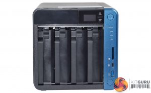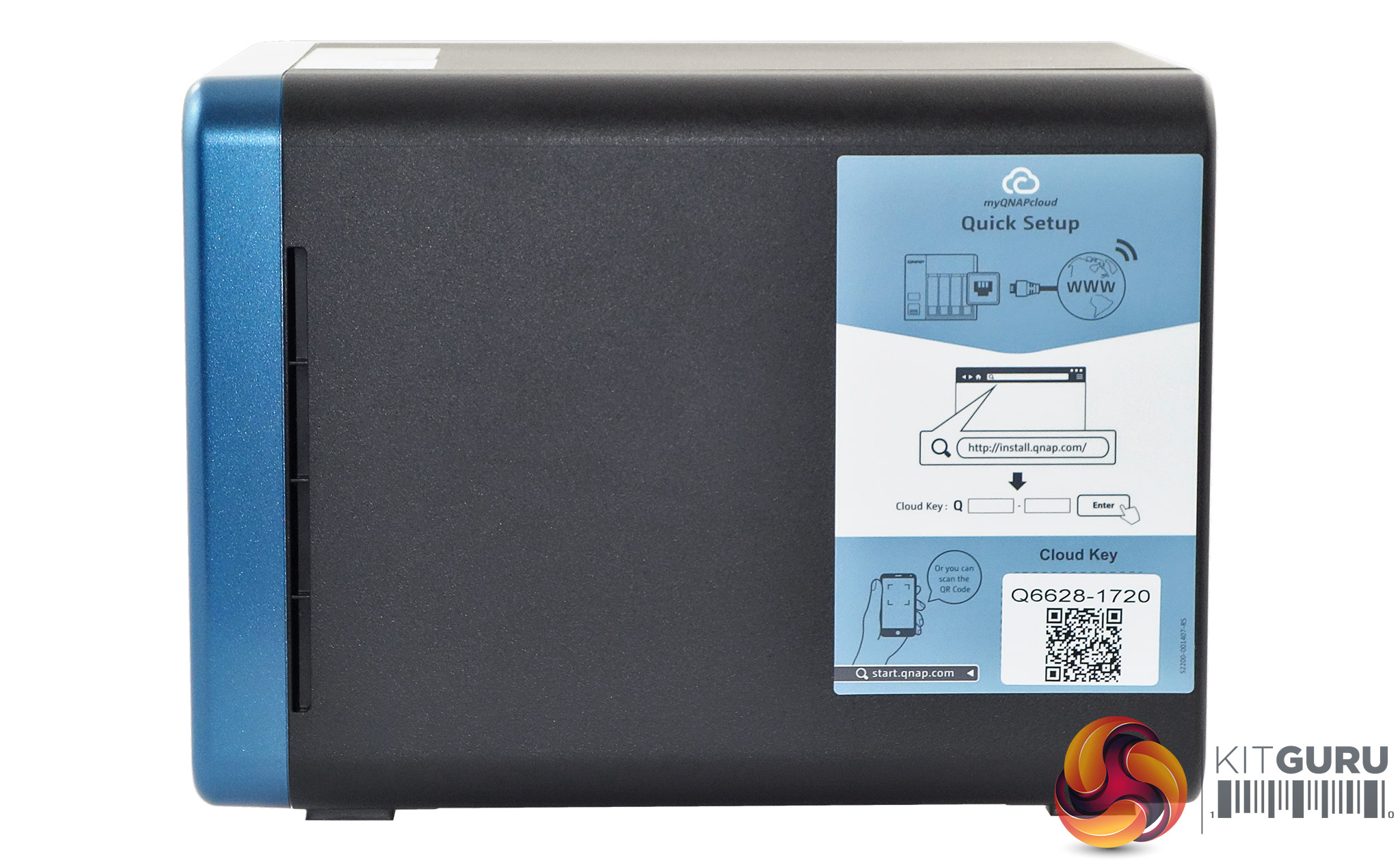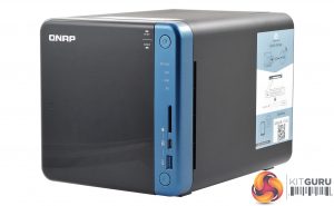 QNAP's TS- x53B series has a new distinctive design finished in black with a metallic blue-gray front bezel strip housing the power button, indicator LEDs and the front ports.