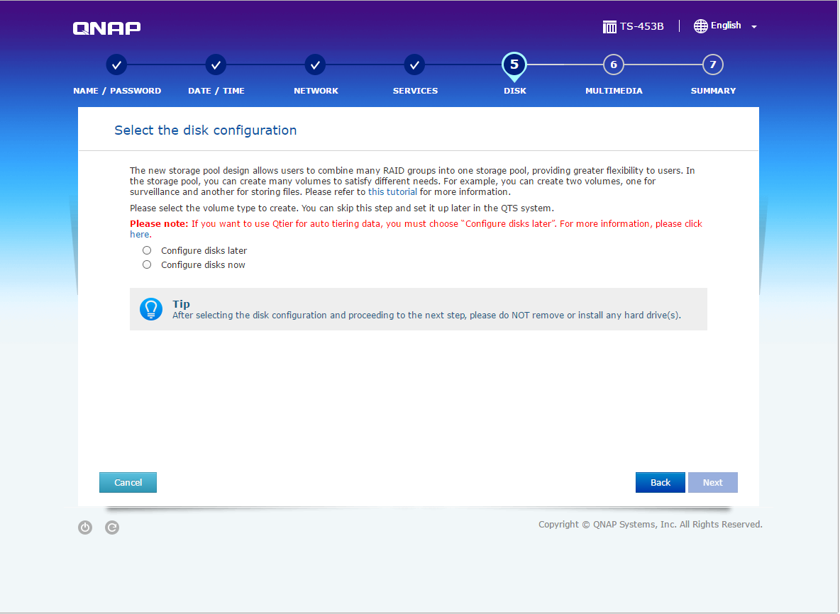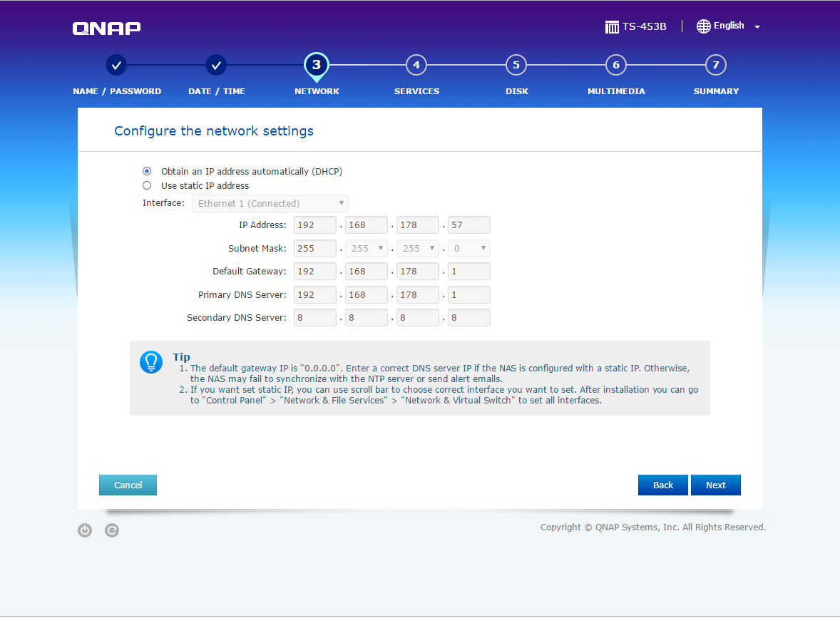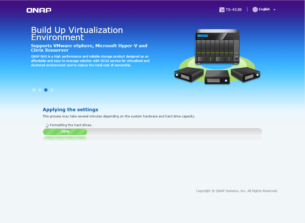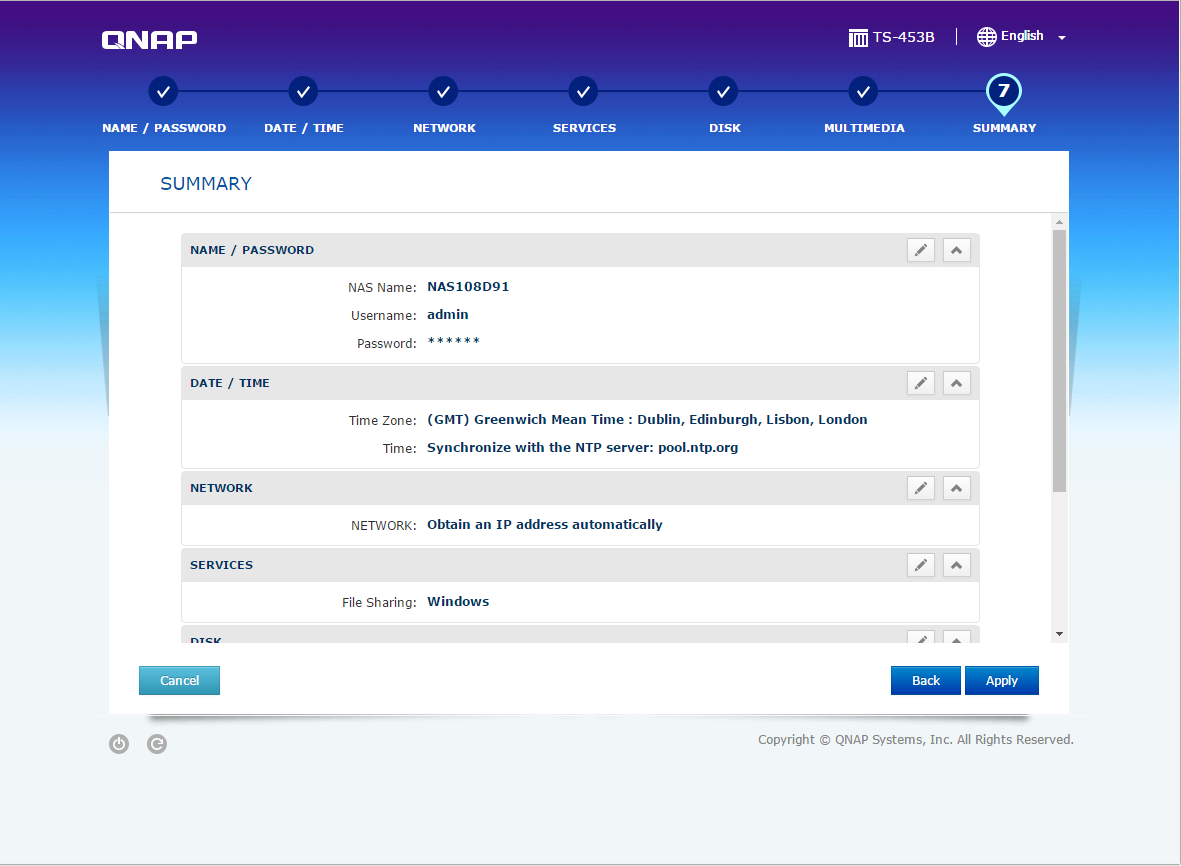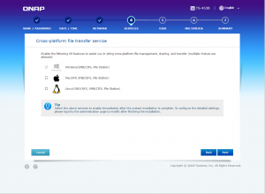 Whichever way you choose to start, it’s just a simple matter of following the install wizard. During the setup you can enable which OS cross-platform file management service you require; Windows (SMB/CIFS, File Station, FTP), Mac (SMB/CIFS, File Station, FTP) and Linux (NFS, SMB/CIFS, File Station, FTP). At this stage you can also load a few basic apps; Photo Station, Music Station, iTunes Server, DLNA Media Server and Download Station.