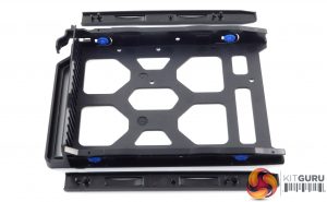 The drive trays are made of plastic and have grab handles moulded into them. The trays are held in place with small latches. Supporting both 3.5in and 2.5in drives, the larger drives are held in place by plastic strips that fit into grooves in the drive tray's sides, and each plastic strip has pins that fit through the tray and into the drive's side mounting holes.
