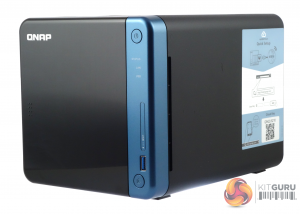The TS-453Be is a smart looking, compact 4-bay NAS design finished in black, with a metallic blue-gray front bezel strip housing the power button, indicator LEDs and the front USB port. The three indicators are for, from top to bottom, Status, LAN activity and USB activity. Towards the bottom of the bezel is the USB 3.0 port for the One Touch Copy button that sits under it.