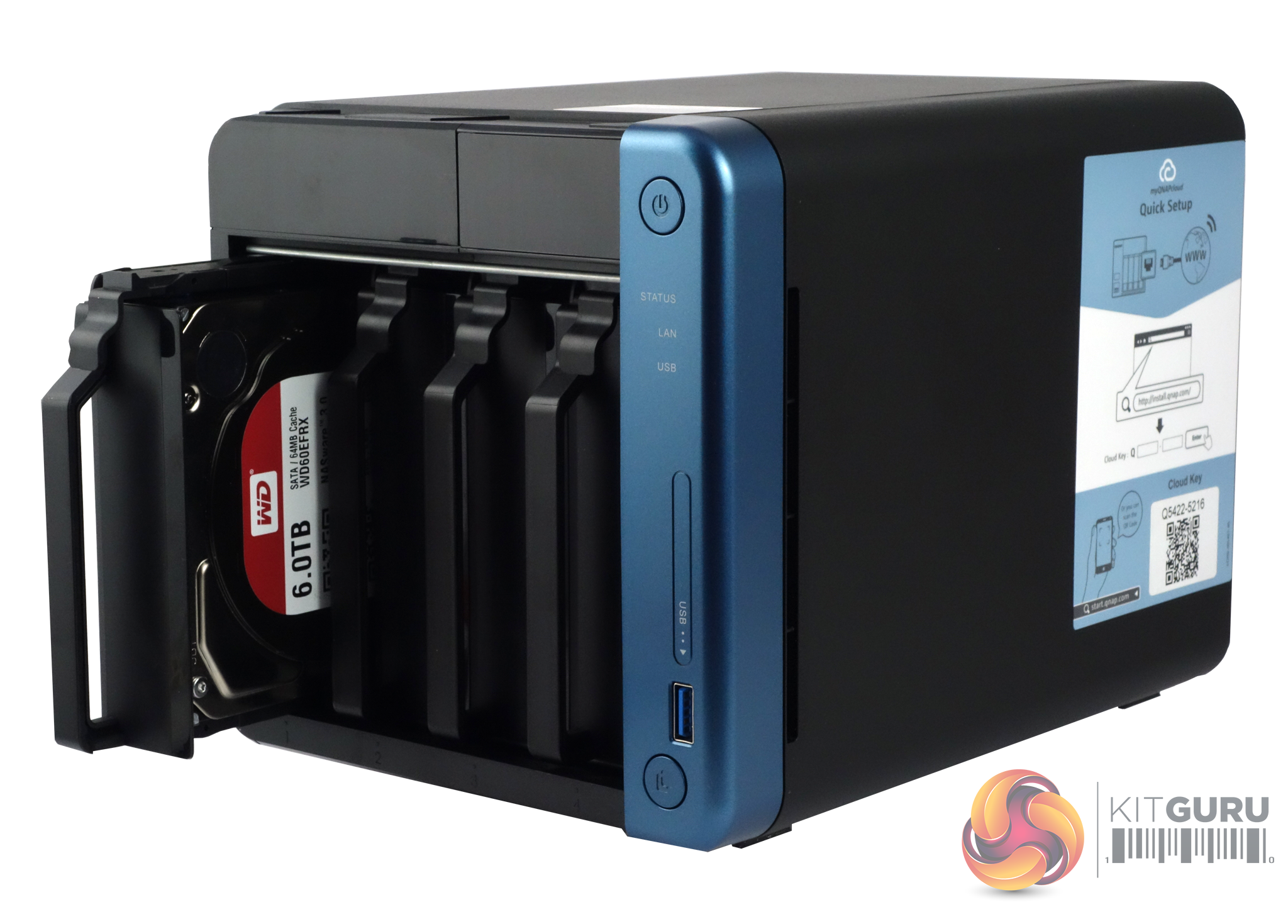 The tool free drive bays sit behind a glossy piano black front panel which slides on and off, though there is a lock to hold it in place. There are no locks on the drive trays themselves.