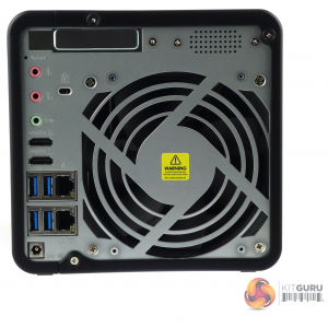 The rear panel is dominated by the cooling grill for the 120mm fan. To the left of this grill sit all the external ports. There are three vertically mounted 3.5mm jacks, two microphone inputs and one line out. Under these are two HDMI v1.4b ports and then four USB 3.0 Type A ports, which are vertically mounted and sit next to a pair of Gigabit LAN ports.