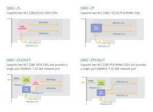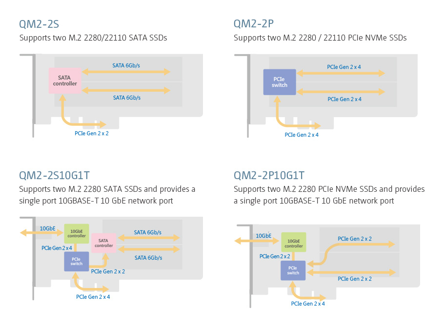 The QM2 family of add-in cards consists of four models, supporting either SATA or PCIe M.2 SSDs and/or 10GbE networking. The differences between each of them is best summed up by the diagram above taken from QNAP’s website.