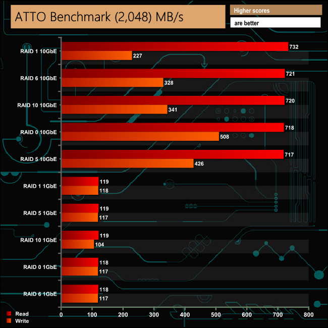 Using a single Gigabit Ethernet connection, the sequential read/write performance of the TS-453Be peaks at 119MB/s and 118MB/s respectively which is around the maximum speed you will see from that interface. The 10GbE performance is very good, taking into account that while the QM2-2P10G1T card has a PCIe x4 interface, the PCIe slot in the TS-453Be is only x2. Peak read performance came in the RAID 1 setup at 732MB/s while the best write performance we saw came from the RAID 0 array at 508MB/s.