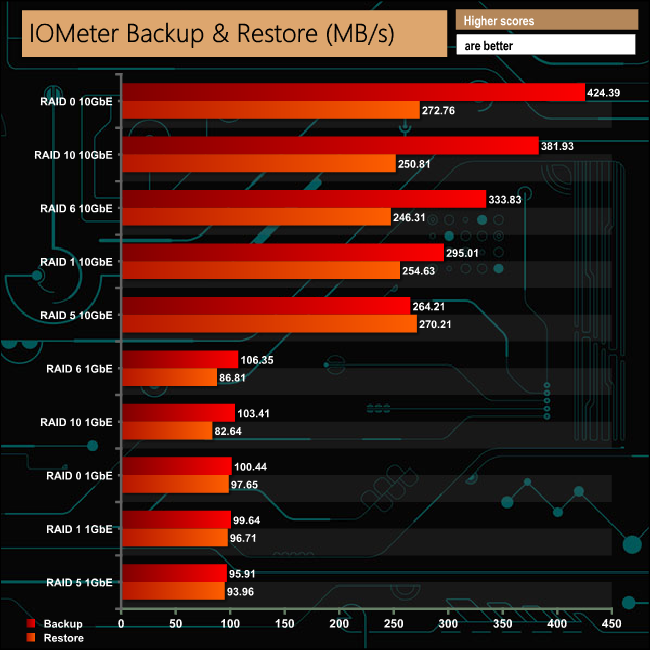 The TS-453Be had no problems dealing with our backup/restore tests. With a 10GbE connection the transfer speed averaged 339.87MB/s when backing up data and 258.94MB/s when restoring it. With a single 1GbE connection, the average backup speed was 101.15MB/s with restores coming in at 91.55MB/s.