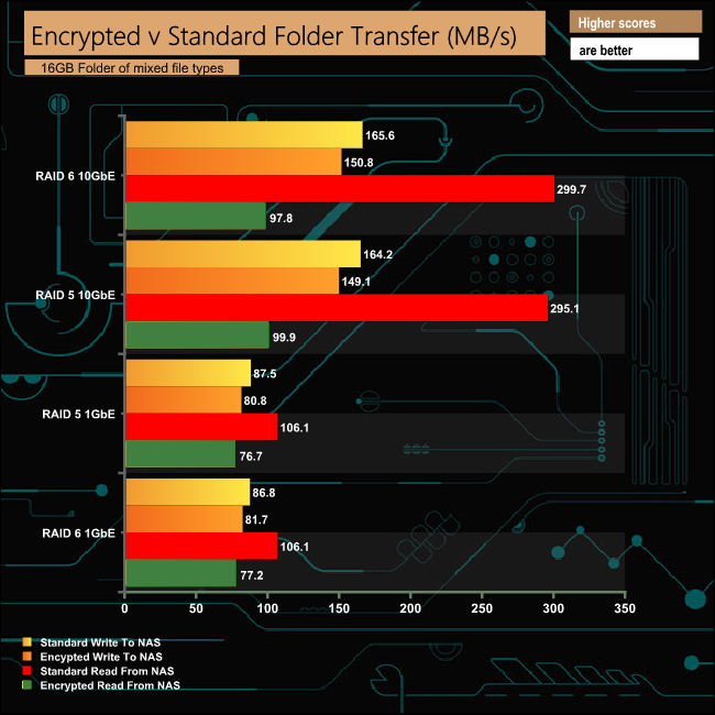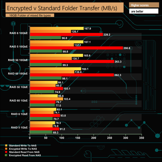 The TVS-1282 seems to be much more efficient when writing encrypted data than reading it. It also appears to handle both encryption read and write duties in a more balanced way with a 1GbE connection than when using a 10GbE one.