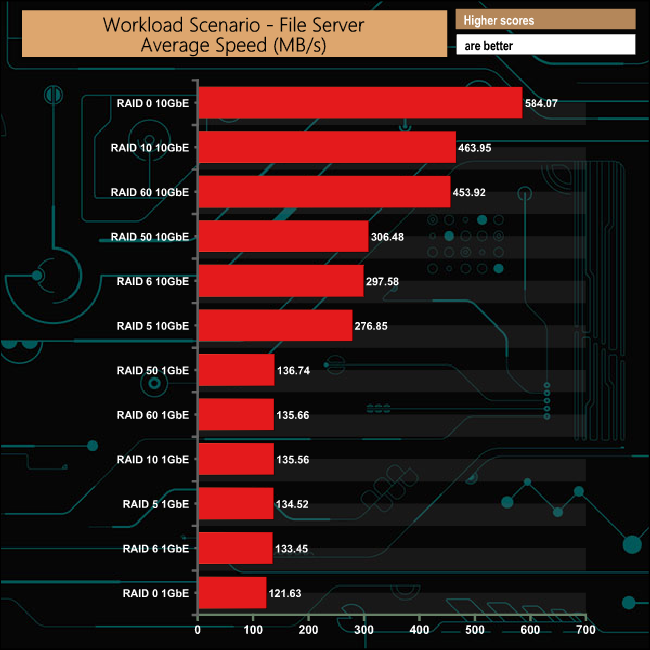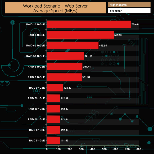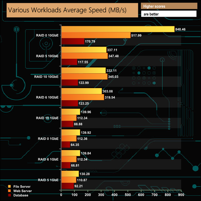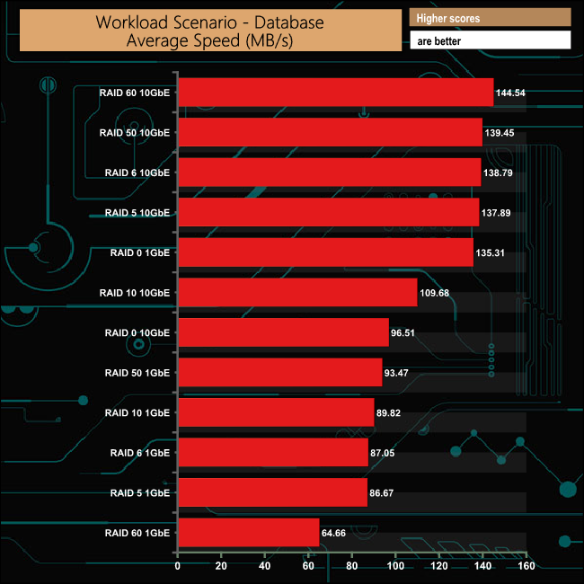 While the File and Web server tests produced much faster average speeds when using a 10GbE connection, the Database test produced results that were a lot closer between the two connection speeds.
