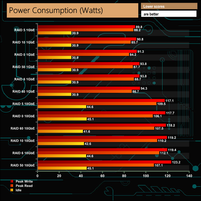 Powered by a CPU with a TDP of 65W, the TVS-1282 is never going to be exactly frugal with its power requirements when actively reading or writing, even with hard drives as power efficient as WD's Red drive is. Adding a 10GbE card to the mix doesn't exactly help matters either.
